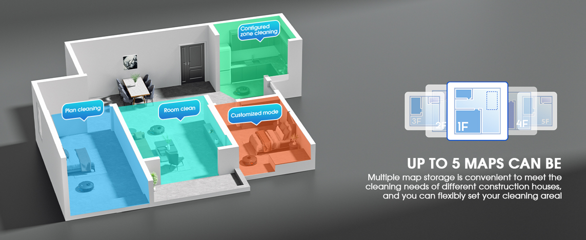 Can save up to 10 maps, eliminating the need to rebuild maps when moving the robot in a duplex structure home, which enhances cleaning efficiency;