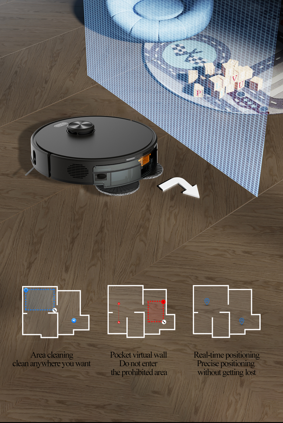 Easily set no-go zones on the APP map to protect sensitive areas like pet food bowls and wire entanglement zones, making cleaning smarter and home safer.